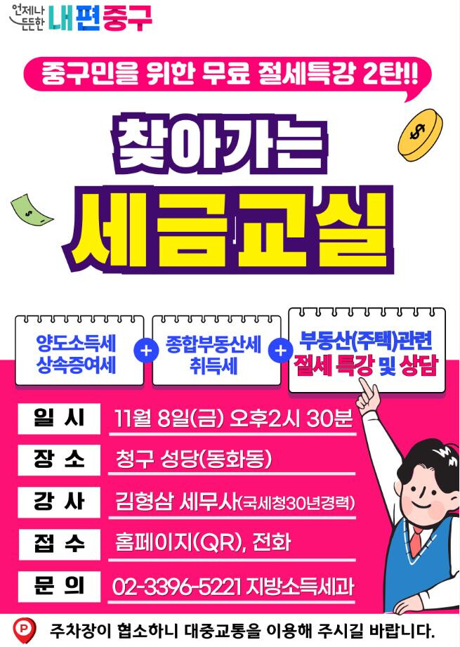 강의 후에는 중구 야간 세무상담을 운영하는 전문 세무사들이 일대일 맞춤형 상담을 통해 개인별 절세 전략을 제안한다. 상담은 선착순 10명을 대상으로 한다.