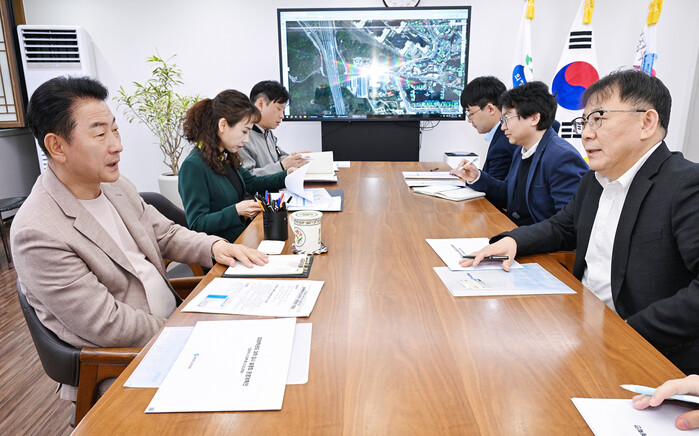 경기 의정부시가 14일 시장실에서 국내 대표 입시 전문 교육기업인 강북 메가스터디학원과 ‘2026학년도 대학입시설명회’ 개최를 위한 실무 협의를 진행했다. 이번 협의는 지역 학생과 학부모에게 정확하고 신뢰도 높은 입시 정보를 제공하고, 실질적인 진로ㆍ진학 설계에 도움을 주고자 마련됐다. 사진은 김동근 시장(왼쪽)이 ‘2026학년도 대학입시설명회’ 개최를 위한 실무 협의를 진행하는 모습. (사진=의정부시청 제공)