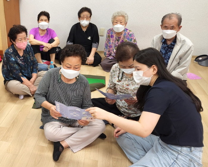 | ▲ 돌봄SOS센터 관계자가 방학3동 지역 아파트 경로당을 방문해 노인들에게 긴급돌봄에 대해 설명하고 있는 모습. (사진제공=도봉구청) |