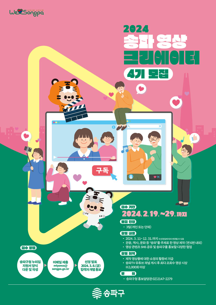 [시민일보 = 이대우 기자] 송파구(구청장 서강석)가 오는 29일까지 올해 구의 다양한 매력을 발굴해 영상으로 제작, 홍보할 영상크리에이터 3팀을 모집한다.