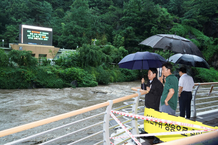 [시민일보 = 이대우 기자] 이성헌 서울 서대문구청장(왼쪽)이 지난 17일 오전 호우로 수위가 불어난 홍제천을 찾아 안전 관리 실태를 점검하고 ‘이번 비로 주민 피해가 발생하지 않도록 만전을 기할 것’을 관계 공무원들에게 지시하고 있다.
