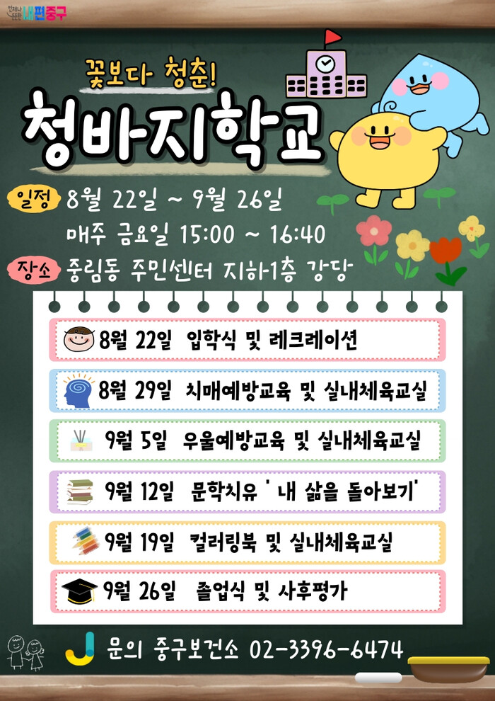 [시민일보 = 여영준 기자] 서울 중구는 노인들의 신체·정신 건강 증진을 위한 대표적인 맞춤형 건강 프로그램인 '청바지학교' 신입생을 오는 14일까지 모집한다고 밝혔다.