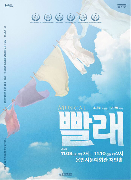 [용인=오왕석 기자] 용인문화재단(이사장 이상일)은 오는 11월 9일과 10일 양일간 용인시문예회관 처인홀에서 대한민국 대표 스테디셀러 창작 뮤지컬 ‘빨래’를 개최한다.
