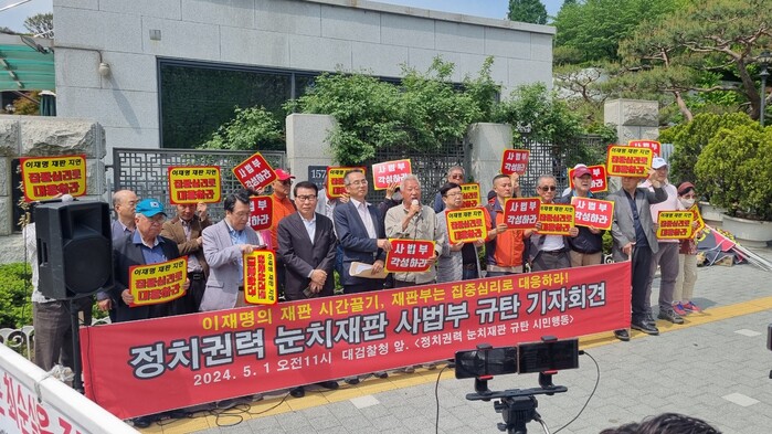 최인식 대표는 이날 오전 11시 시위에 앞서 ‘정치 권력 눈치 재판 사법부를 규탄한다’ 제하의 성명서를 통해 “‘김명수 대법원’이 양산한 비양심적 법관들에 의한 재판 지연이 다반사로 일어나고 있다”며 “ 재판 지연만 해도 거대한 불의인데, 상식과 양심에 어긋난 판결까지 쏟아내니, 법봉이 깡패가 휘두르는 쇠파이프와 다를 바 없게 되었다”고 성토했다.