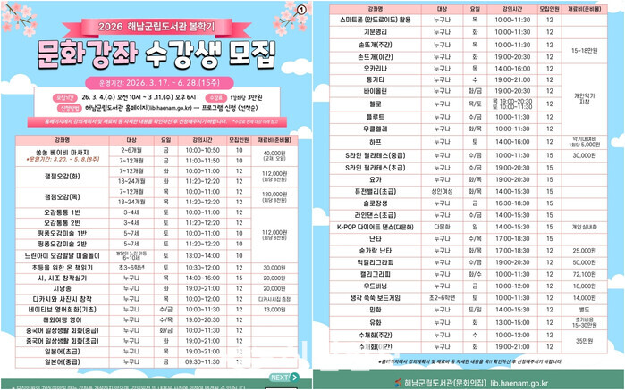 수강신청은 3월 4일부터 11일까지 해남군립도서관 누리집을 통해 온라인 접수로 진행된다.