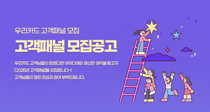 [시민일보 = 박소진 기자] 우리카드는 고객중심경영을 실천하고 금융소비자의 생생한 목소리를 경청하기 위해 온오프라인 고객패널을 모집 중이라고 밝혔다.
