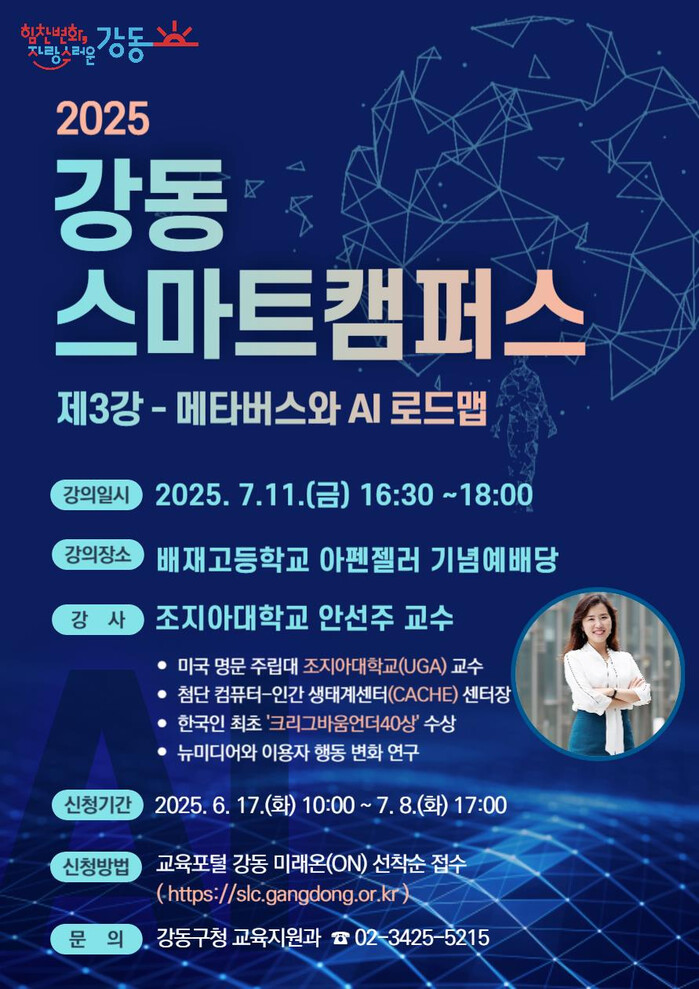 강의는 오는 7월11일 오후 4시30분~6시 배재고등학교에서 ‘메타버스와 AI 시대·인문사회과학적 로드맵’이라는 주제로 미국 명문 주립대학인 조지아대학교 안선주 교수가 강연을 진행할 예정이다.