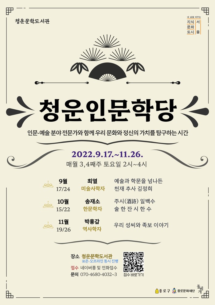 정문헌 구청장은 “청운인문학당을 통해 우리 문화와 정신에 대한 깊이 있는 이해와 우리 문화예술에 대한 자부심을 고취하는 시간이 되길 바란다”고 밝혔다.