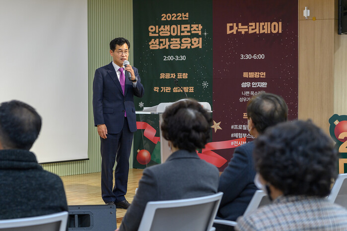 | ▲ 양천구 지방보조금 지원사업 중 하나인 ‘인생이모작 프로그램 성과 공유회’에서 인사말 중인 이기재 구청장. (사진=양천구청 제공) |