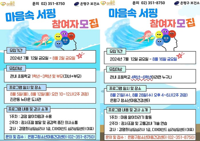 [시민일보 = 이대우 기자] 서울 은평구(구청장 김미경)는 8월 여름방학 시즌을 맞이해 은평구 청소년마음건강센터와 함께 관내 초등학생의 마음 건강을 위한 ‘마음속 서핑’ 프로그램을 접수한다고 밝혔다.