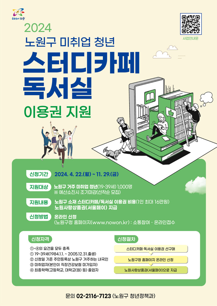 구는 청년이 지역내 스터디카페·독서실 이용권을 구매한 후, 노원구청 홈페이지를 통해 온라인 신청을 하면 추후 본인 명의 휴대폰으로 노원사랑상품권(서울페이)을 환급해주는 방식으로 지원하며, 150시간 상당의 이용권 비용으로 최대 16만원을 지원한다. 지난해 지원받은 사람도 올해 신청이 가능하다.