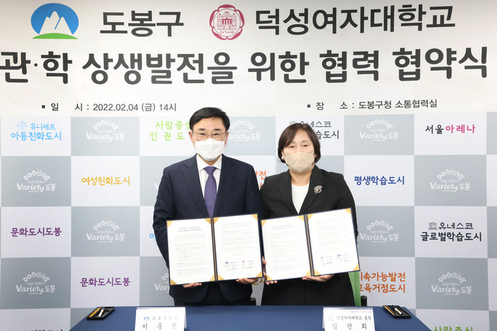 도봉구가 최근 지역내 덕성여자대학교와 '관·학 상생발전을 위한 협력 협약'을 체결했다. 양 기관은 협약을 통해 공동발전과 우호증진에 힘을 합치고, 교육 등 각 분야에서 긴밀한 협력관계를 유지하기로 했다. 사진은 협약식에서 이동진 구청장(왼쪽)과 김건희 총장이 기념촬영을 하는 모습. (사진제공=도봉구청)
