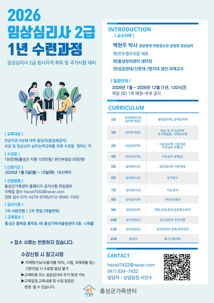 교육과정은 오는 2월부터 12월까지 총 12회기로 매월 셋째주 토요일에 운영할 예정이며, 교육 수료자는 임상심리사 2급(국가자격증) 취득 응시자격인 수료증을 받게 된다.
