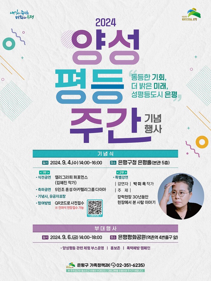 [시민일보 = 이대우 기자] 서울 은평구(구청장 김미경)는 평등 문화 확산을 위한 ‘양성평등주간 기념행사’를 오는 9월 4일과 6일 개최한다고 밝혔다.