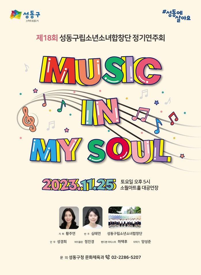 한편, 1991년 창단 이래 올해로 스무 번째 정기연주회를 맞이하는 성동구립 여성합창단은 겨울로 접어드는 길목에서 구민들을 위로하고 다양한 장르의 음악들을 즐길 수 있도록 준비했다.