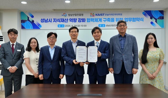 [성남=오왕석 기자] 성남산업진흥원(원장 이의준)과 KAIST 문술미래전략대학원(대학원장 박성필)은 8월 29일 성남산업진흥원 7층 회의실에서 ‘성남시 지식재산 역량 강화 협력체계 구축을 위한 업무협약’을 체결했다.