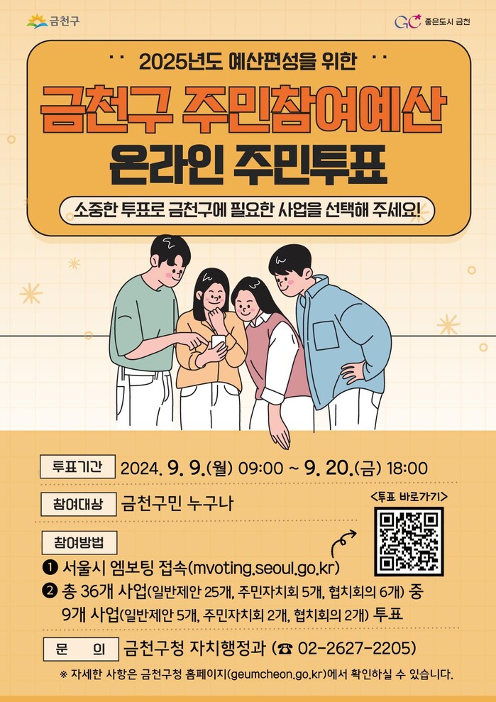 [시민일보 = 여영준 기자] 금천구(구청장 유성훈)는 9~20일 ‘2025년도 금천구 주민참여예산사업’ 선정을 위한 온라인 주민투표를 한다고 밝혔다.