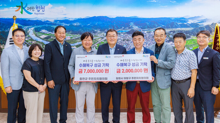 합천군(군수 김윤철)은 21일 창원시 의창구 주민자치협의회(회장 이흥진)와 합천군 주민자치협의회(회장 강광열)에서 집중호우 피해극복 성금을 각각 200만원, 700만원 기탁했다고 밝혔다.