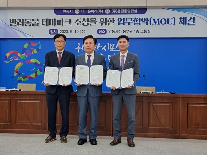 ‘더나은미래㈜’가 경북 안동시 및 ‘흥원종합건설’과 함께 안동시 안막동 일원에 조성되는 반려동물 테마파크 조성을 위한 민관협력 업무협약(MOU)을 체결했다.