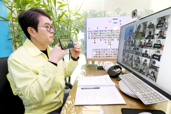 서울 성동구는 16일 간부직이 솔선수범하고 전직원이 동참해 스스로 청렴의지를 다지는 ‘청렴 실천 다짐’ 서약식을 비대면으로 개최했다. 사진은 정원오 구청장이 간부회의에서 영상을 통해 성동구 전체 간부직과 청렴실천 퍼포먼스를 하고 있는 모습. (사진제공=성동구청)