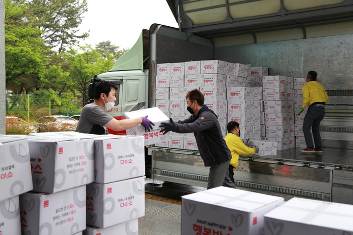 | ▲ 아성다이소 직원들이 울진 산불피해 지역 이재민을 돕기 위해 트럭에 행복박스를 싣고 있다.(사진제공=아성다이소) |