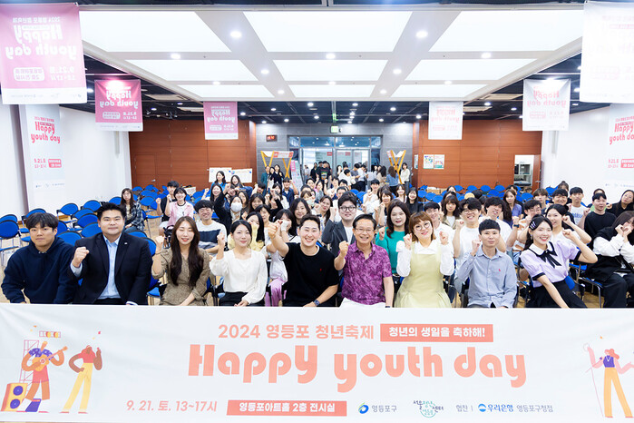 영등포구가 지난 21일 영등포아트홀 2층 전시실에서 2024 영등포 청년축제 HAPPY YOUNGH DAY를 진행했다. 사진은 축제에 참석한 최호권 구청장(앞줄 왼쪽 여섯 번째)이 참여자들과 기념촬영을 하고 있는 모습.(사진=영등포구청 제공)