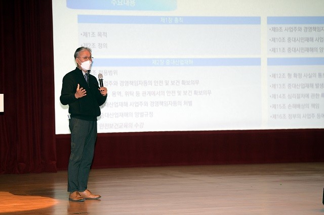 강의를 맡은 심우배 ㈜어스 대표이사는 행정안전부 주관 지자체 대상 ‘중대재해처벌법’ 설명회 강의와 해당법의 해설 가이드 제작에 참여한 전문가로, 중대재해처벌법의 주요 내용을 소개하고, 경영책임자의 안전보건 확보 의무, 안전보건관리체계 구축 및 의무이행사항 등 대응 방안을 설명했다.