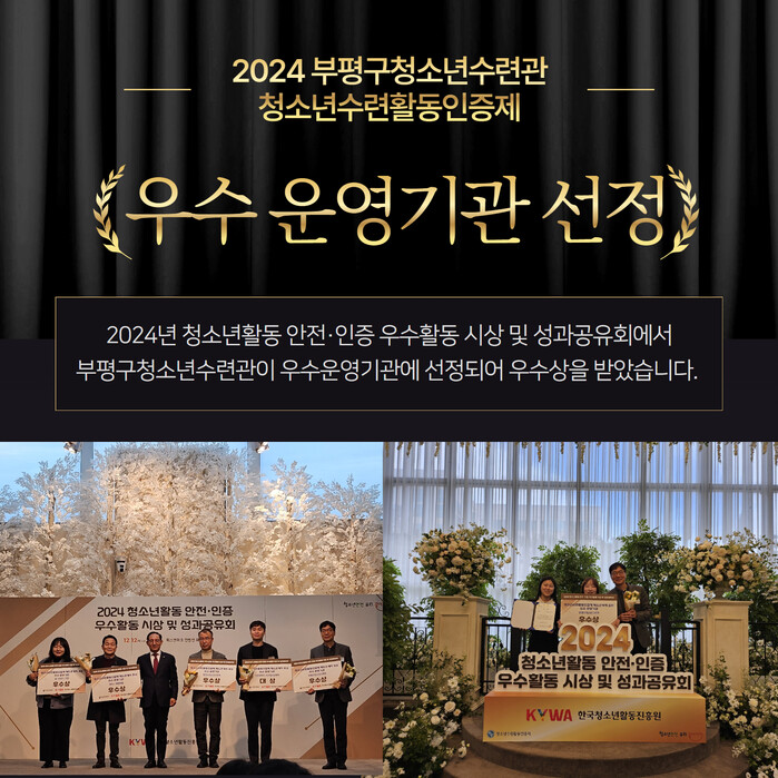 부평구청소년수련관은 진흥원이 기준으로 제시한 평가항목 전반에 걸쳐 높은 성적을 거뒀으며, 이번 수상으로 안전하고 우수한 수련활동이 가능한 시설임을 전국에 알릴 수 있었다.