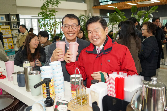 | ▲ 이필형 동대문구청장(사진 오른쪽 첫 번째)과 최홍연 부구청장(사진 오른쪽 두 번째)이 구청사 카페에서 개인 텀블러를 이용하고 있다. (사진=동대문구청 제공) |