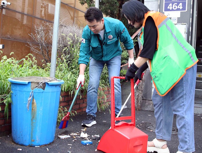 서울 도봉구는 최근 ‘클린도봉 대청소의 날’을 맞아 쌍문역과 상점가를 중심으로 대대적인 환경정화 활동을 실시했으며, 특히 우기를 맞아 빗물받이를 점검하고 내부 퇴적물을 제거했다. 사진은 이날 오언석 구청장(왼쪽)이 길거리 버려진 담배꽁초 등 쓰레기를 청소하고 있는 모습. (사진=도봉구청 제공)