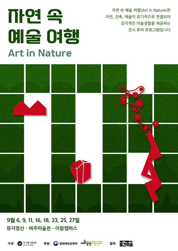 문화체육관광부와 예술경영지원센터가 후원하며, 비전컬쳐가 기획·운영을 맡은 이 프로그램은 서울에서 출발해 원주의 뮤지엄SAN, 여주의 여주미술관, 양평의 이함캠퍼스를 하루 동안 둘러보는 일정으로 구성된다. 투어는 9월 6일(토), 9일(화), 11일(목), 16일(화), 18일(목), 23일(화), 25일(목), 27일(토) 총 8회, 참가비는 무료로 진행되며 프로그램 내에는 전용 셔틀버스와 전시 해설, 체험 활동 등이 포함되어있다.