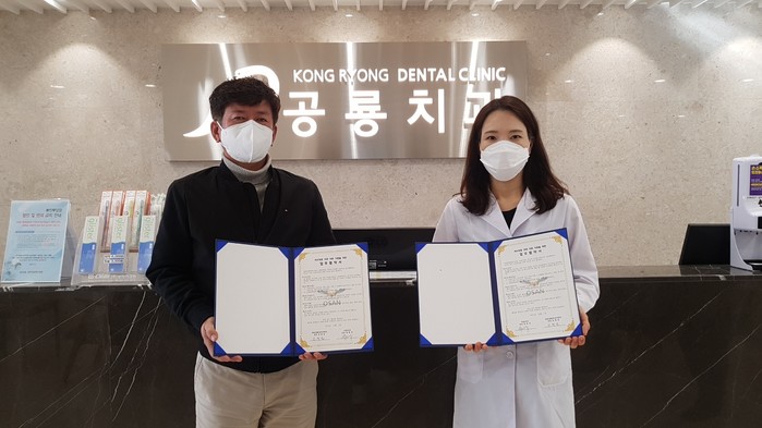 경기 오산시 대원동행정복지센터가 최근 지역내 공룡치과와 저소득층 치과 치료 지원을 위한 업무협약을 체결했다. 이번 협약을 통해 공룡치과는 월 2명 이내 100만원 상당의 치료비를 지원한다. 사진은 협약식에서 관계자들이 기념촬영을 하는 모습. (사진제공=오산시청)