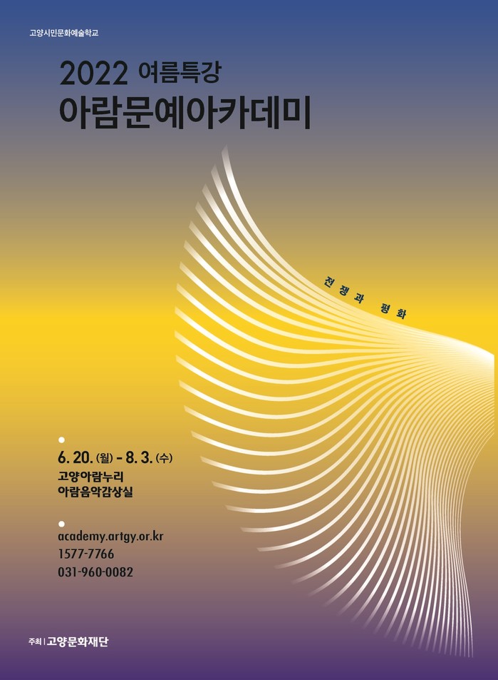 [고양=이기홍 기자] 고양문화재단은 고양아람누리 문화예술교육 프로그램 <2022 여름특강 아람문예아카데미 – 전쟁과 평화>를 6월 20일 월요일부터 8월 3일 수요일까지 6주간 진행한다.