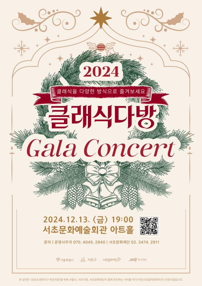 [시민일보 = 박소진 기자] 서울 서초구(구청장 전성수)와 서초문화재단은 오는 12월13일 저녁 7시 서초문화예술회관에서 ‘2024 클래식다방 갈라 콘서트’를 연다고 밝혔다.