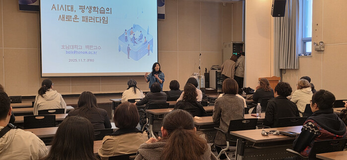 오전에는 ‘인공지능(AI) 시대, 평생학습의 새로운 패러다임’ 이란 주제로 백란 호남대학교 인공지능(AI) 빅데이터 연구소장의 특강이 진행됐다. 백 소장은 교육에 AI가 미치는 영향과 평생교육 응용의 예, 현장 실무자들에게 유용한 인공지능 기반 소프트웨어 등을 강의했다.