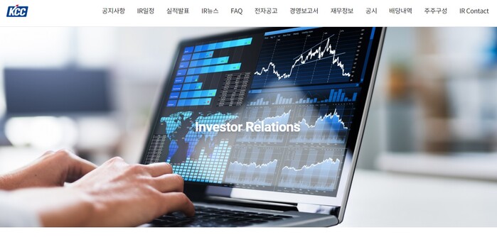 KCC는 지난 2023년 주주소통 강화를 목적으로 IR 전담조직을 구성하고 자사 홈페이지 내 IR 섹션을 구축했다. IR섹션을 통해 KCC는 온라인 배당 조회 시스템, 주요 QnA, 경영보고서, 실적 등 주주가 원하는 정보를 제공하며 소통을 강화했다.