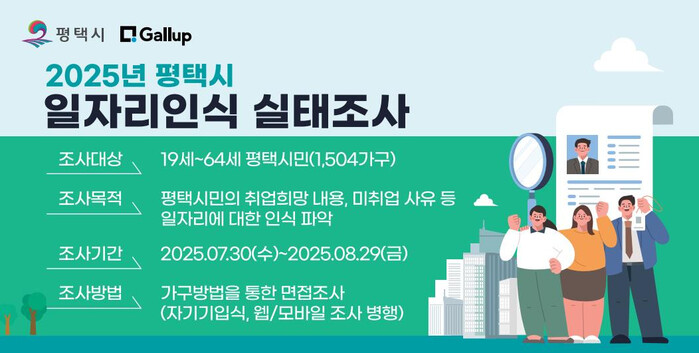 [평택=오왕석 기자] 평택시(시장 정장선)는 일자리에 대한 인식을 파악해 정책자료로 활용하기 위해 7월 30일부터 8월 29일까지 31일간 ‘2025년 평택시 일자리인식 실태조사’를 실시한다.