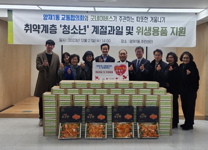 [시민일보 = 이대우 기자] 서울 서초구(구청장 전성수) 양재1동은 최근 지역내 저소득 가구 청소년들의 건강한 성장을 돕기 위해 양재1동 교동협의회와 굿네이버스 서울남부지부가 함께 준비한 후원물품을 전달받았다.