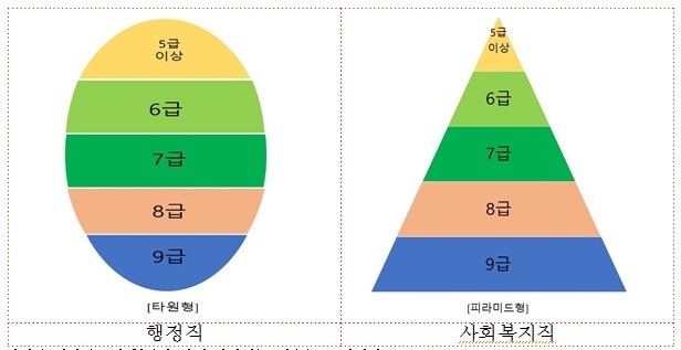 제출된 자료를 도형으로 분석하자면, 대부분의 지자체 행정직 공무원은 세워진 계란 같은 타원형의 형태를 띄고 있으나, 사회복지직 공무원은 피라미드형의 형태를 가지고 있다.