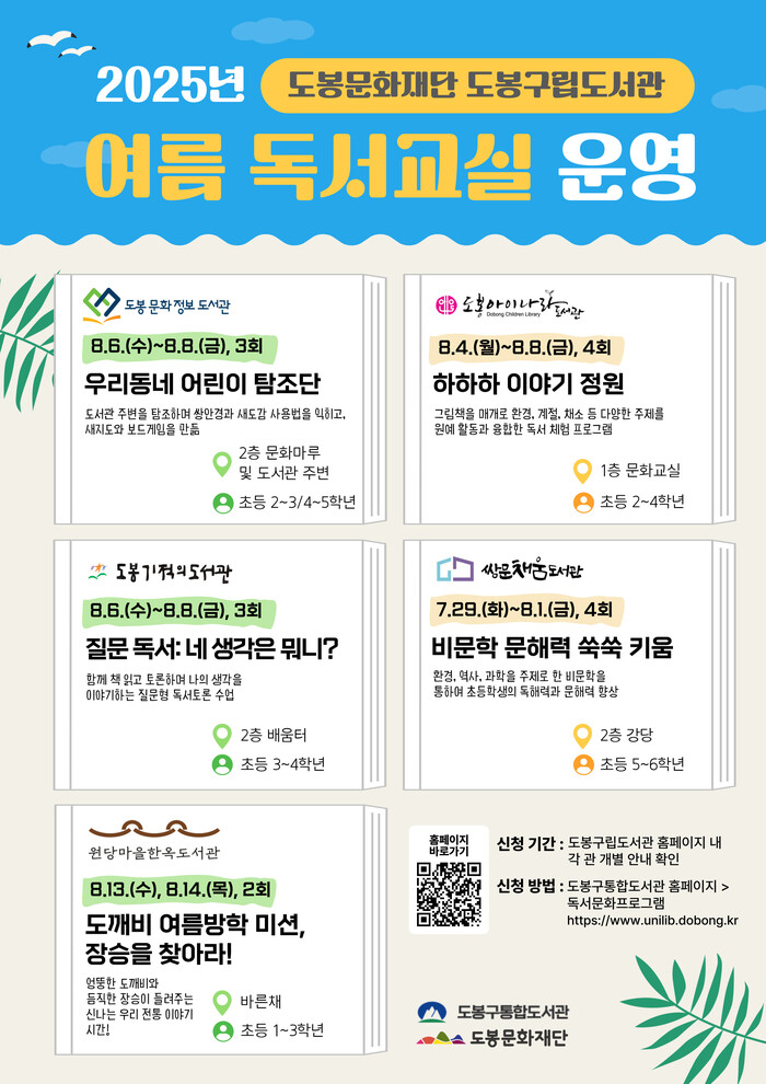 [시민일보 = 문민호 기자] 서울 도봉구(구청장 오언석)가 구립도서관 5개관에서 ‘2025년 여름 독서교실’을 운영한다고 9일 밝혔다.