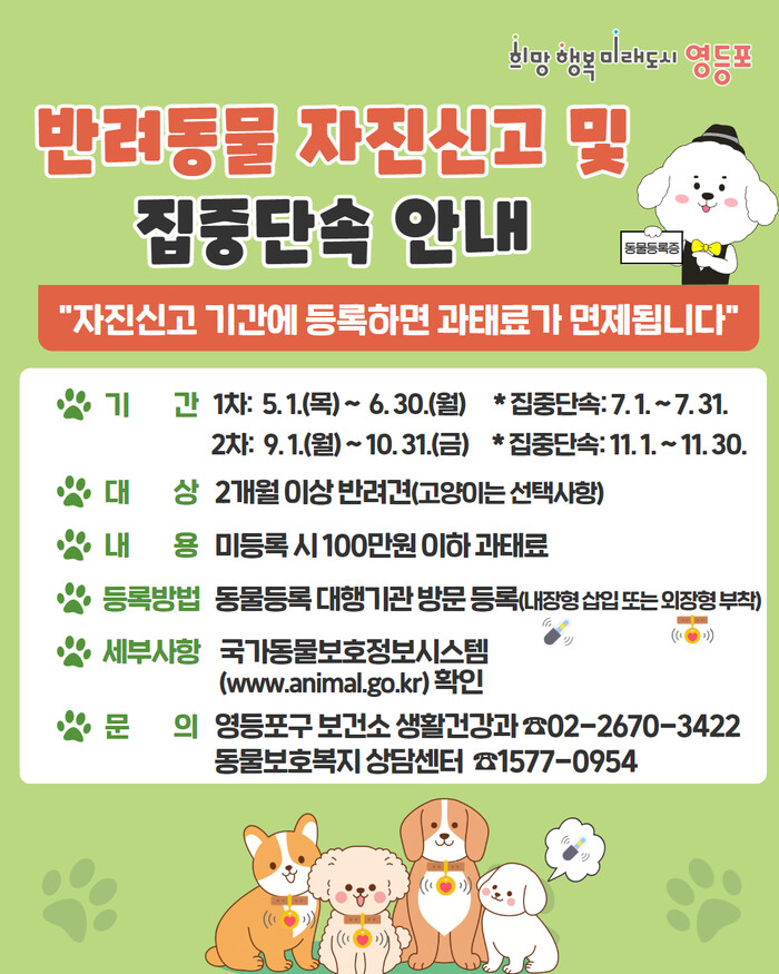 [시민일보 = 여영준 기자] 영등포구(구청장 최호권)는 자발적인 반려동물 등록 유도를 위해 자진신고 기간을 두 차례에 걸쳐 운영하고, 오는 7월과 11월에 집중단속을 실시한다고 밝혔다.
