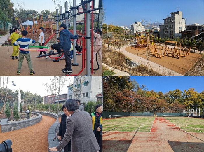| ▲ 왼쪽부터 청소년 체력단련시설, 어린이 생태놀이터, 맨발황톳길, 테니스장 모습. (사진=은평구청 제공) |