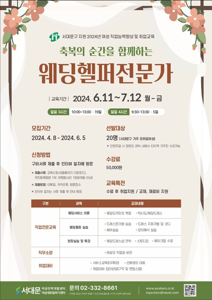 [시민일보 = 변은선 기자] 서울 서대문구(구청장 이성헌)가 지역내 거주 미취업 여성을 대상으로 ‘웨딩헬퍼 전문가 양성과정’을 운영한다.