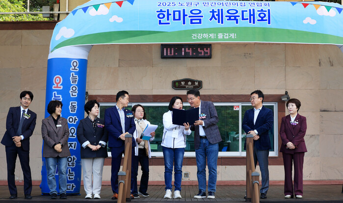 오승록 서울 노원구청장이 최근 ‘2025 노원구 민간어린이집연합회 한마음 체육대회’ 개회식에 참석해 영유아와 학부모, 보육교직원들을 격려했다. 사진은 오 구청장이 개회선언을 하는 모습. (사진=노원구청 제공)