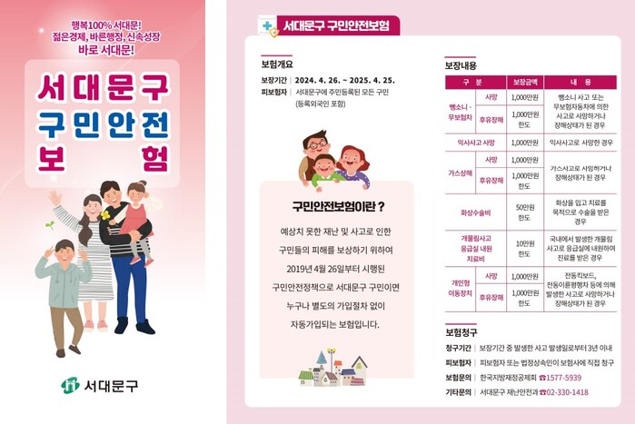 서대문구 구민안전보험은 구가 2019년부터 가입해 운영 중으로 뺑소니·무보험차상해, 가스상해, 개인형이동장치상해 등으로 사망하거나 후유장해를 입은 경우 최대 1000만원까지 보장이 가능하다.