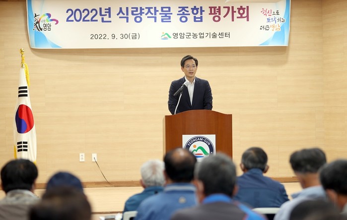 [영암=정찬남 기자] 전남 영암군(군수 우승희)은 지난 9월 30일 농업기술센터에서 시범단지 대표 및 농업인 학습단체, 선도농가 등 50명을 대상으로 식량작물 전반에 걸친 성과와 문제점에 대한 개선방안을 마련하고자 “2022년 식량작물 종합평가회”를 개최했다.