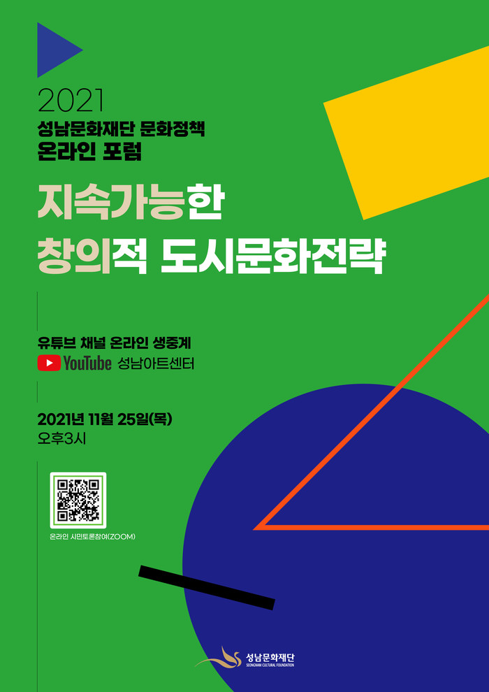 [성남=오왕석 기자] 남문화재단(대표이사 노재천)이 유네스코 창의도시 네트워크 회원도시를 향한 첫걸음으로 성남의 도시문화전략과 정책의제를 논의하는 <2021 성남문화재단 문화정책 온라인 포럼>을 오는 11월 25일(목) 오후 3시 재단 공식 유튜브 채널을 통해 생중계로 개최한다.