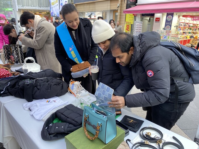 | ▲ 명동 관광객들이 진품과 위조품을 구별해 보고 있다. (사진=중구청 제공) |