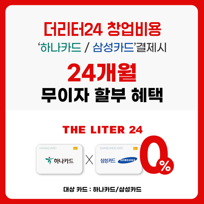 더리터24 무인카페창업비용을 '하나카드, 신한카드'로 결제 시 최대 24개월간 무이자 할부를 제공하고 있다.