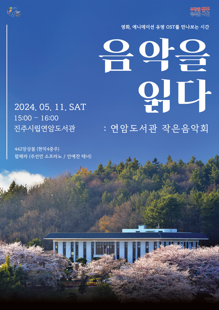 진주시립도서관은 5월 가정의 달을 맞이하여 오는 11일 오후 3시 연암도서관에서‘음악을 읽다: 연암도서관 작은음악회’를 개최한다.